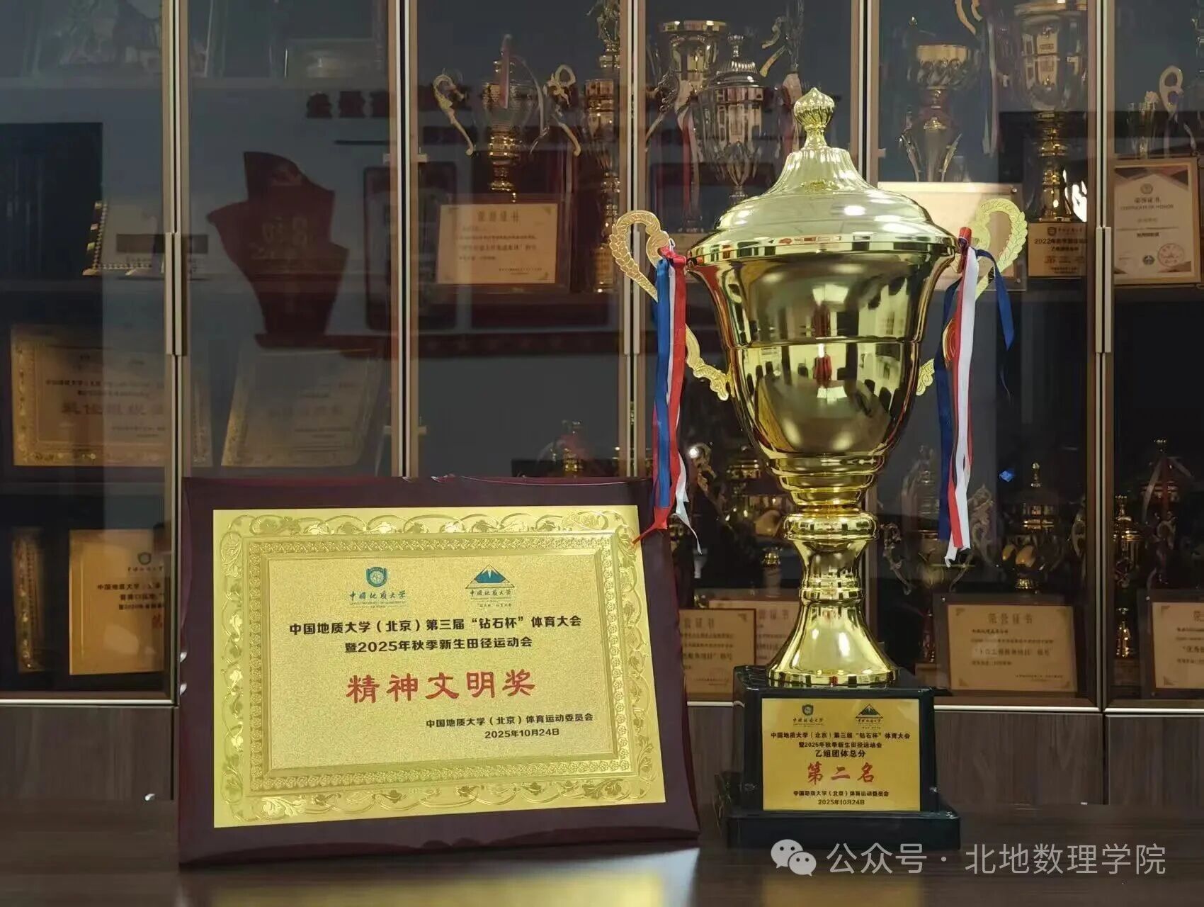 2025年10月23日至10月24日,中国地质大学(北京)隆重举行秋季新生田径运动会。在此次运动会中,数理全体25级学子积极进取、努力拼搏,共获三块金牌、六块银牌、九块铜牌,为学院取得 乙组团体总分第二名 与 精神文明奖 的荣誉。