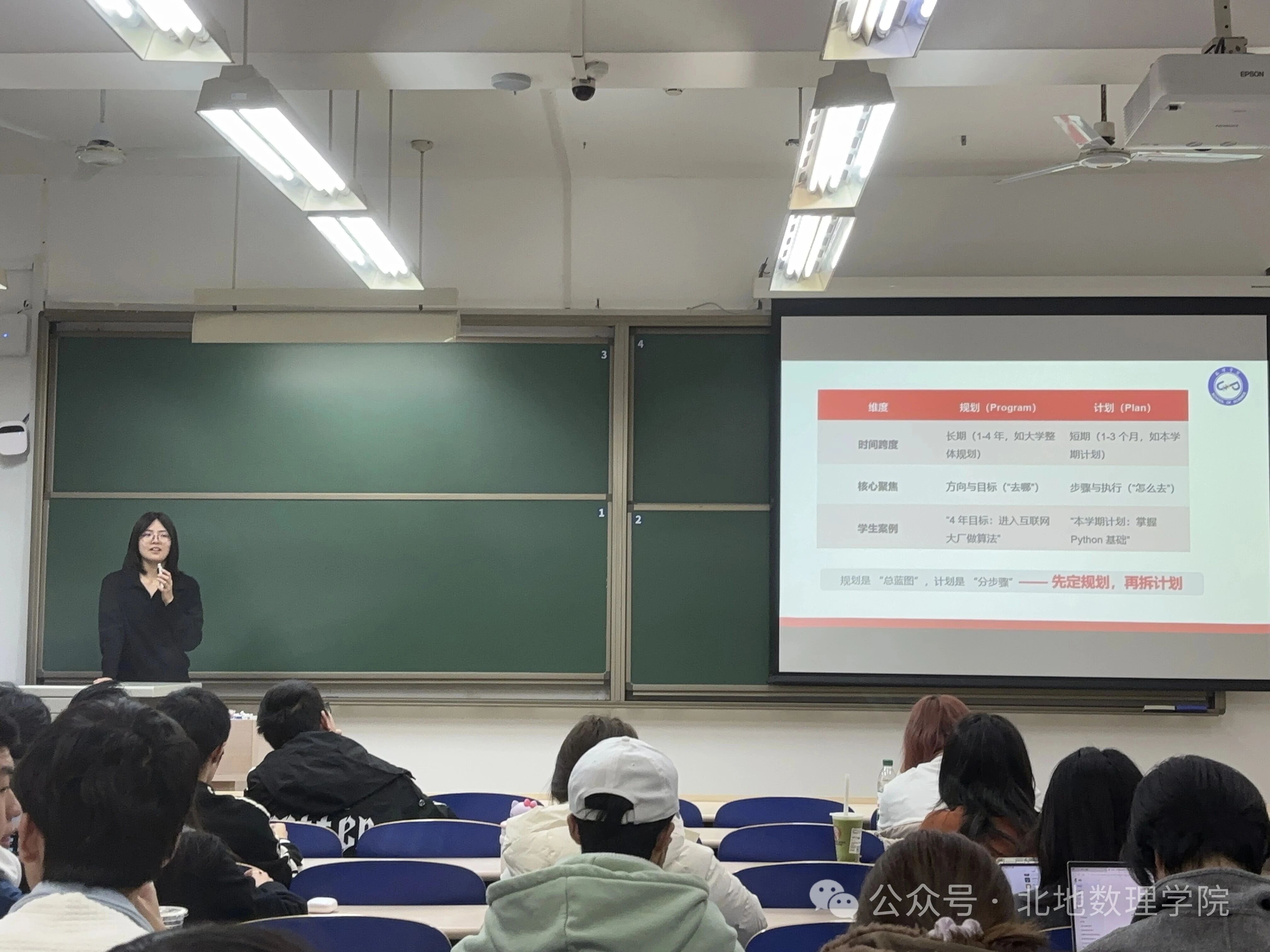 在实践操作环节,宋老师引入行动推进 GREEN 模型,从目标(Goal)、资源(Resource)、执行(Execution)、风险(Exception)、下一步(Next-step)五个维度,指导同学们现场制定个人规划。同学们积极参与,有的聚焦保研升学,明确专业课提升、科研项目参与、夏令营申请等关键步骤;有的瞄准金融行业就业,规划数据分析技能学习、实习投递、简历优化等具体行动,现场互动氛围热烈。此外,宋老师还推荐了甘特图、番茄工作法、ToDo 清单等实用时间管理工具,助力同学们高效推进规划落实。